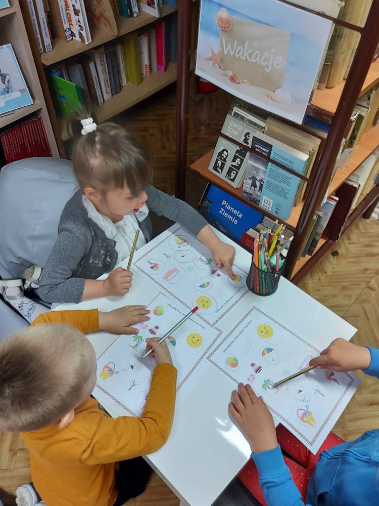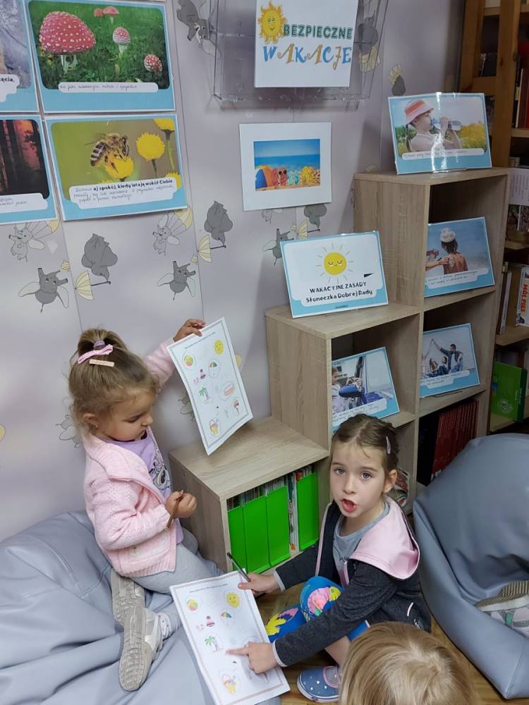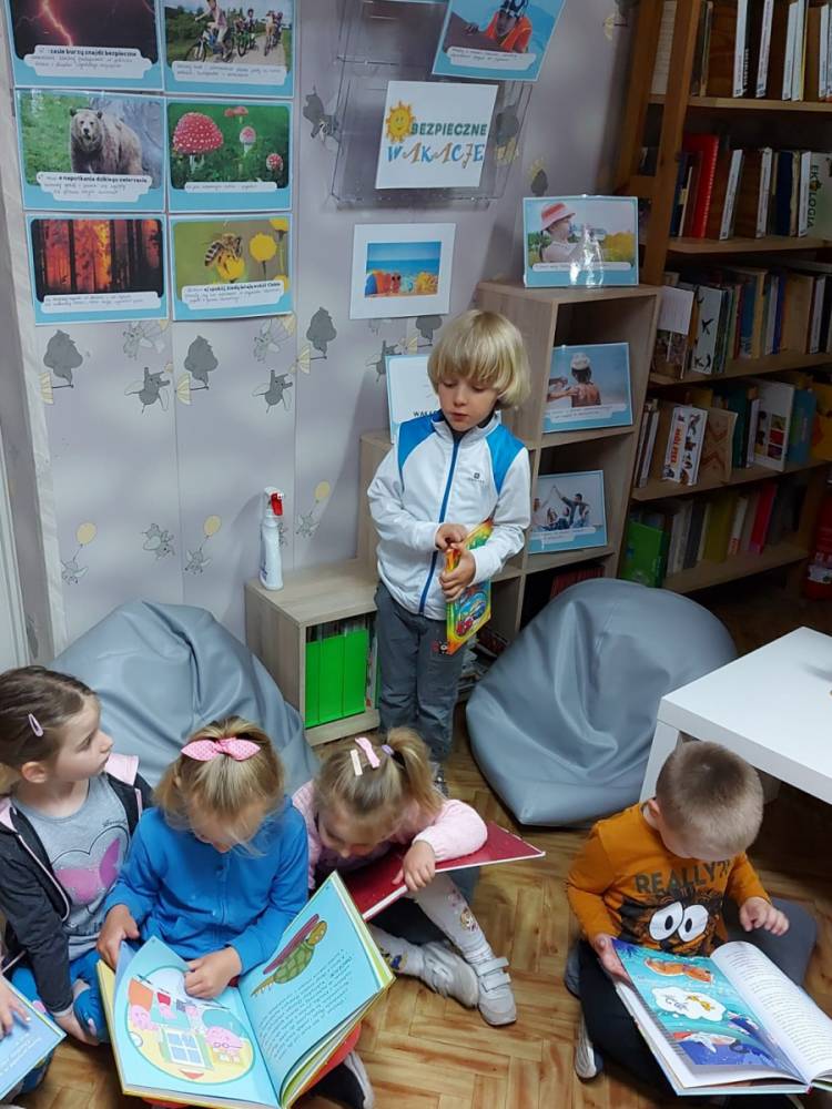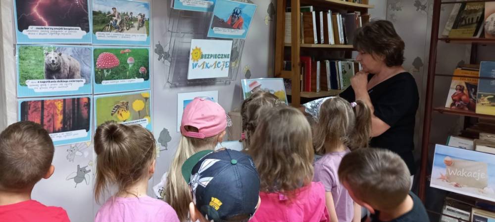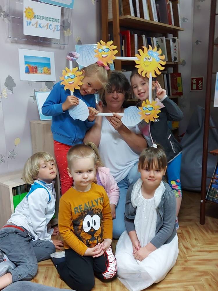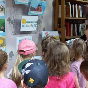 Lekcja rozpoczęła się od rozmowy na temat zasad bezpieczeństwa w podróży, nad morzem, w górach, nad jeziorem, w lesie oraz o różnych niebezpiecznych sytuacjach, które mogą się wydarzyć podczs letniego wypoczynku (zagubienie, kontakt z nieznajomym, z nieznanymi zwierzętami czy zachowanie podczas burzy). Podczs zajęć było widać zaangażowanie dzieci w rozmowę, a po przeczytaniu wiersza pt."Bezpieczne wakacje" M. Cebulskiej przedszkolaki zadawały mnóstwo pytań. W dalszej części spotkania rozwiązywały zadania i pozowały do wakacyjnych zdjęć.