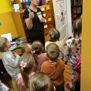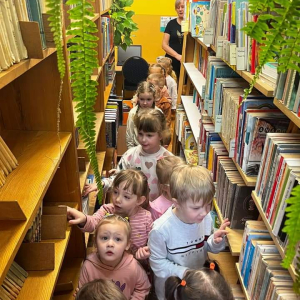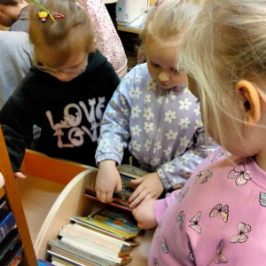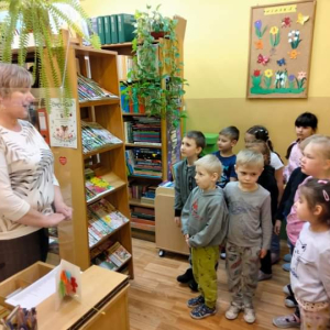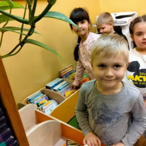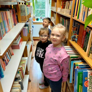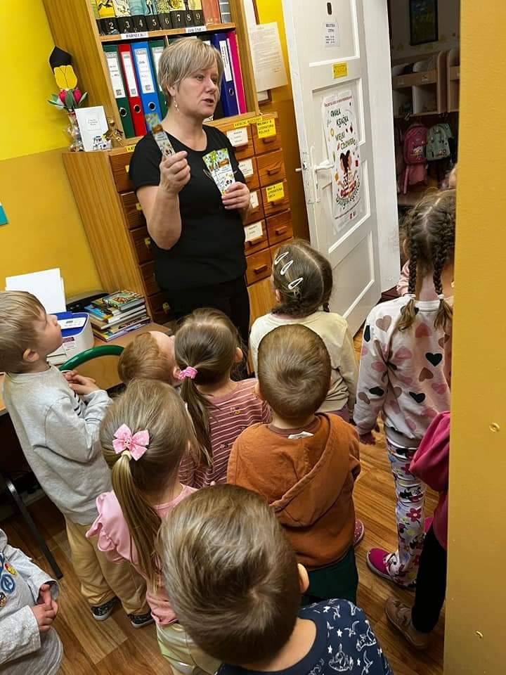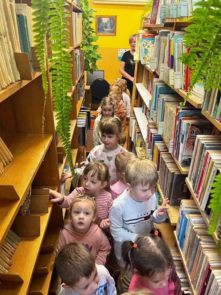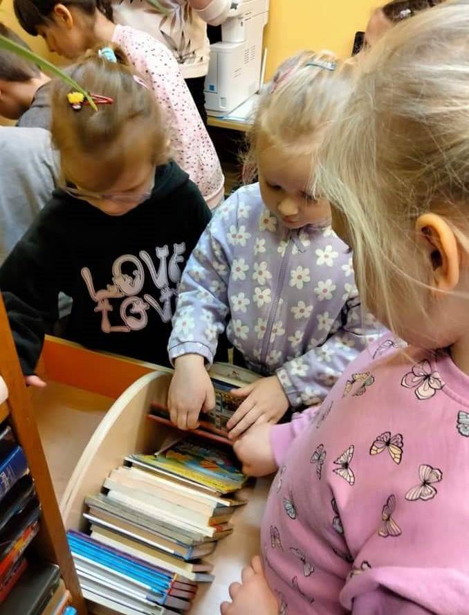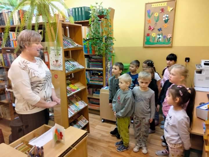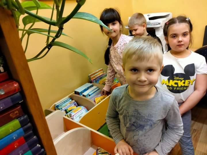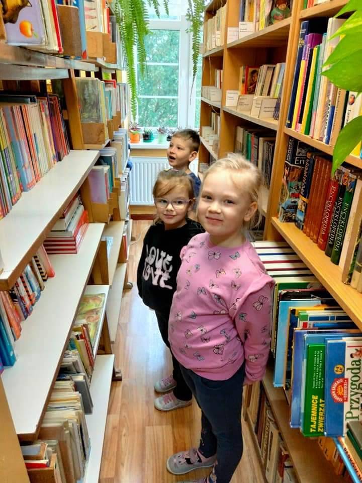 Uczniowie młodszych klas z wizytą w bibliotece.