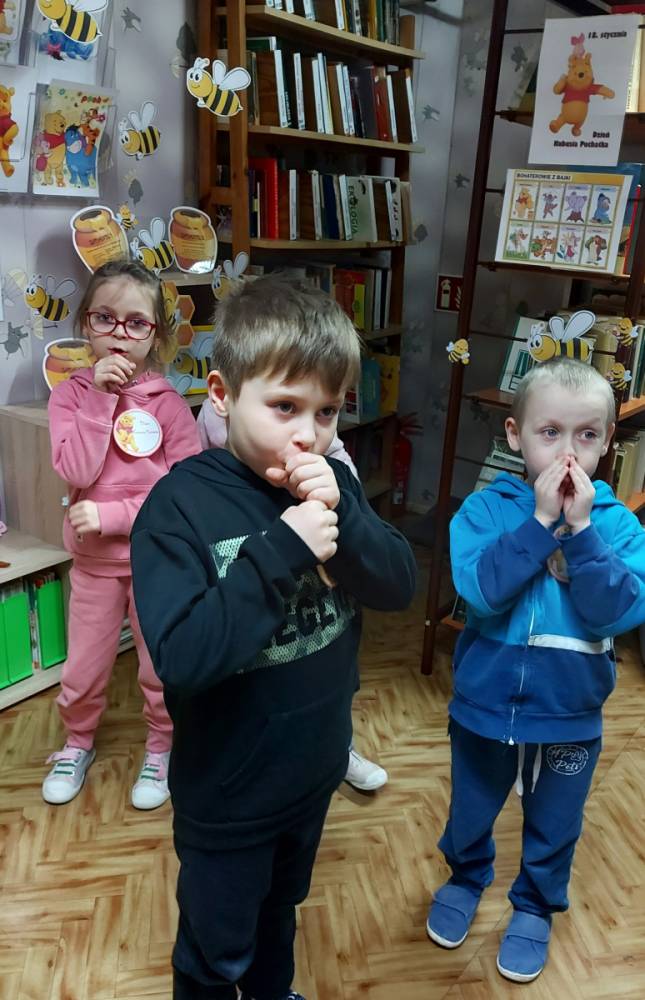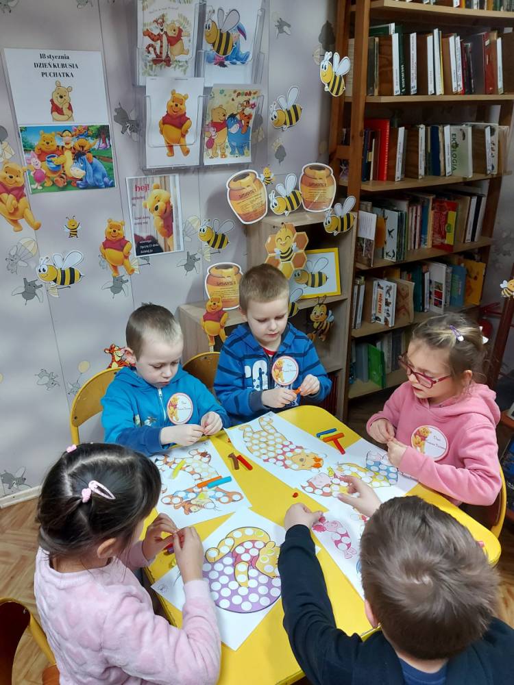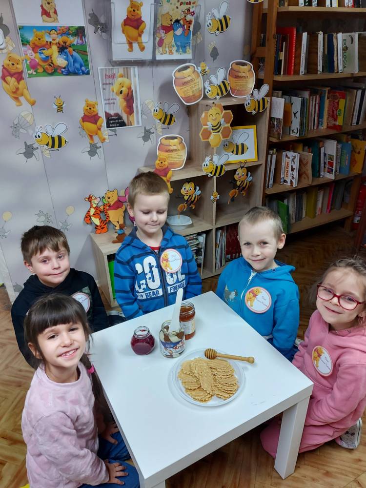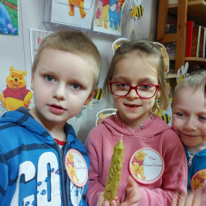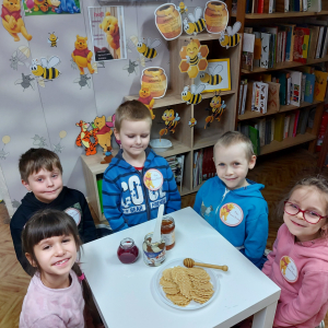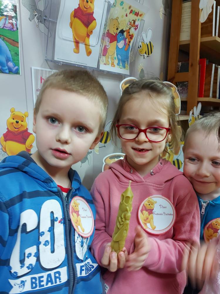 Na cześć Kubusia skosztowaliśmy jego ulubionego przysmaku, czyli "co nieco" i innych słodkości z przepisów książki kucharskiej Puchatka. Rozmawialiśmy o tym skąd się bierze miód. Przedszkolaki zobaczyły też świeczkę z wosku pszczelego (odlaną w specjalnej formie) wykonaną przez uczennicę kl. VII Karinę Wiśniewską. Warto wspomnieć, że Kubuś Puchatek ma własną ulicę w samym centrum Warszawy. Dalej odbyły się puchatkowe gry i zabawy.