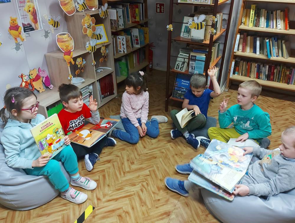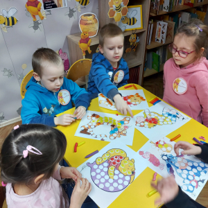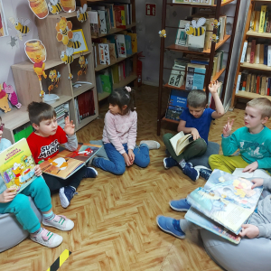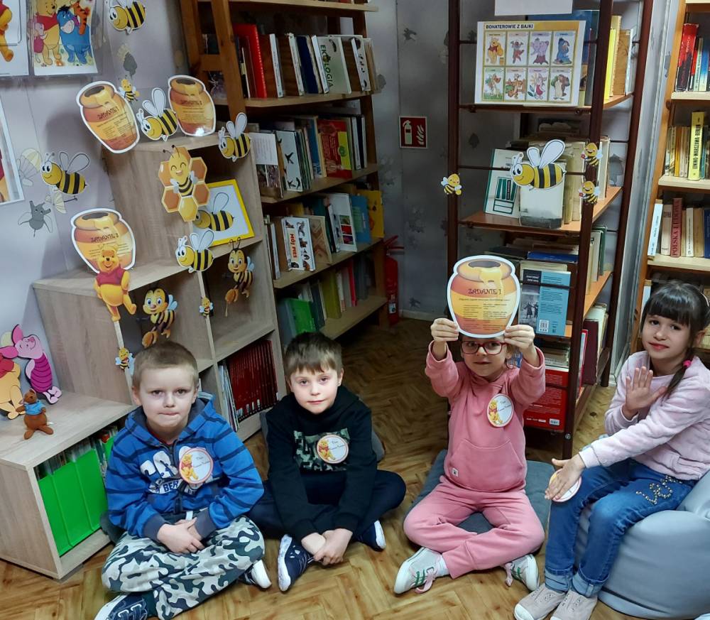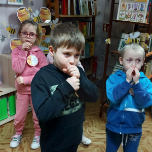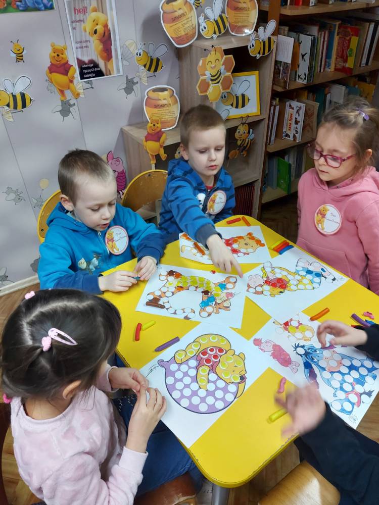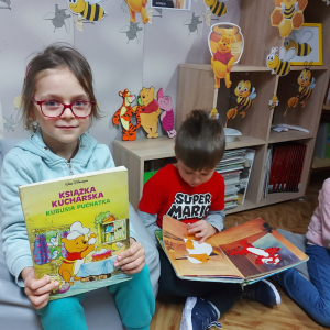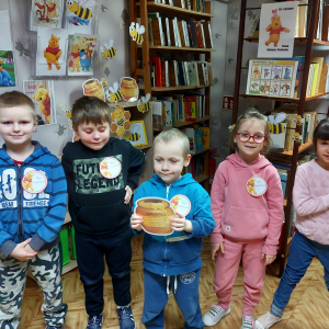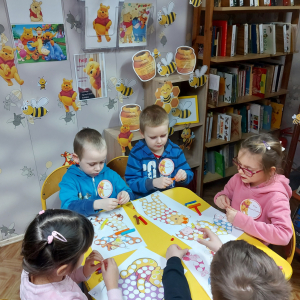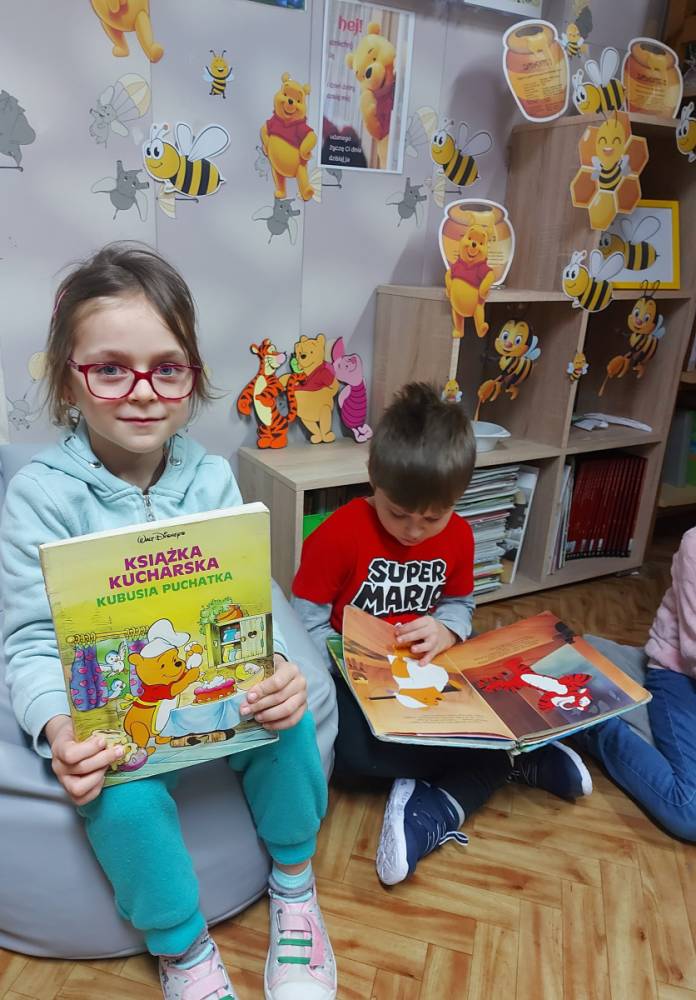 Na cześć Kubusia skosztowaliśmy jego ulubionego przysmaku, czyli "co nieco" i innych słodkości z przepisów książki kucharskiej Puchatka. Rozmawialiśmy o tym skąd się bierze miód. Przedszkolaki zobaczyły też świeczkę z wosku pszczelego (odlaną w specjalnej formie) wykonaną przez uczennicę kl. VII Karinę Wiśniewską. Warto wspomnieć, że Kubuś Puchatek ma własną ulicę w samym centrum Warszawy. Dalej odbyły się puchatkowe gry i zabawy.